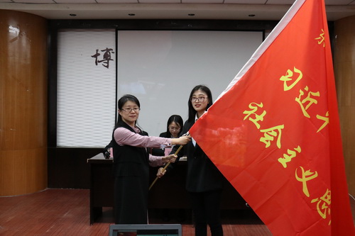 团委书记孙珠红为协会授旗,希望协会能够引领广大青年学生学习好、贯彻好习近平新时代中国特色社会主义思想,自觉用习近平新时代中国特色社会主义思想武装头脑,推动工作,勇于担当使命,并希望同学们积极参加协会活动,主动关注党的动态。