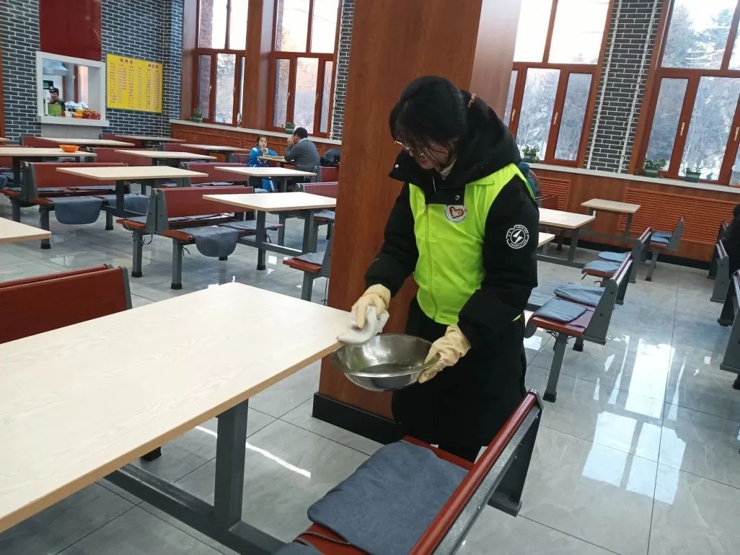 他们分工明确,各自负责打扫不同区域的餐桌。在活动期间,志愿者们严格服从相应负责人的安排每个人都尽公职守,他们默默做着志愿活动。
